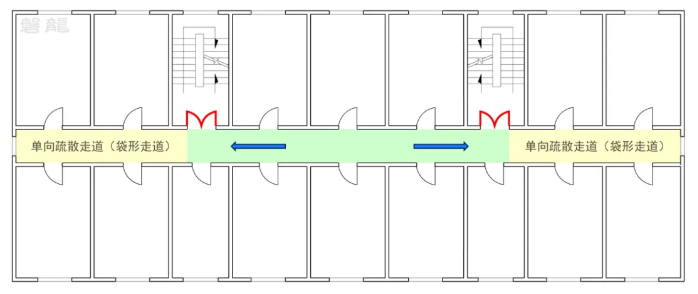 【图示3】单向疏散走道(袋形走道,两侧单向箭头区域)