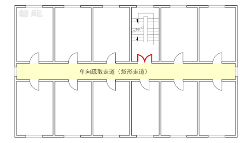 单向疏散走道是指仅能通过一个方向通往安全出口的走道,其尽端无出口,因形似“口袋”,又称“袋形走道”【图示3】。在现行标准中,“位于单向走道的房间疏散门”通常表述为“位于袋形走道的疏散门”。