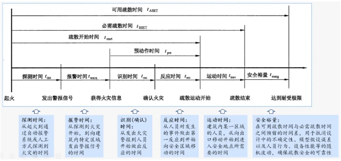 图中对关键时间节点和阶段进行了清晰划分,包括可用疏散时间与必需疏散时间,并进一步细分为探测时间、报警时间、识别(确认)时间、反应时间、运动时间及安全裕量等环节。