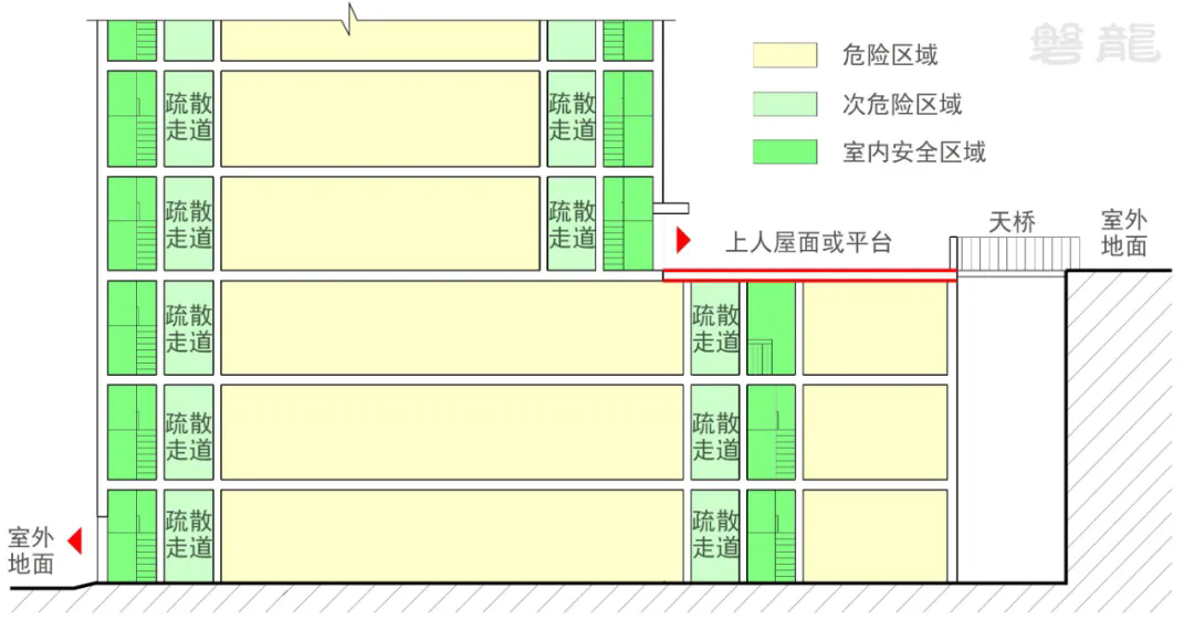 依据风险逐级递减原则,次危险区域仅能向更安全的室内或室外安全区域疏散,不得逆向进入危险区域,通过危险区域疏散。具体要求如下: